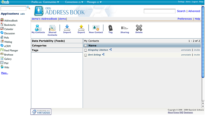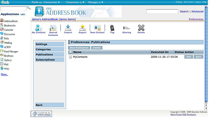 In order to be executed correctly the steps below, there should be ODS Addressbook instance for user demo at the Demo server and there should be ODS Addressbook instance for user demo at the MyOpenlink server. If not existing, it is enough after log in to go to Addressbook from the left ODS Vertical Main Navigation. This will cause automatically to be created ODS Addressbook instance.