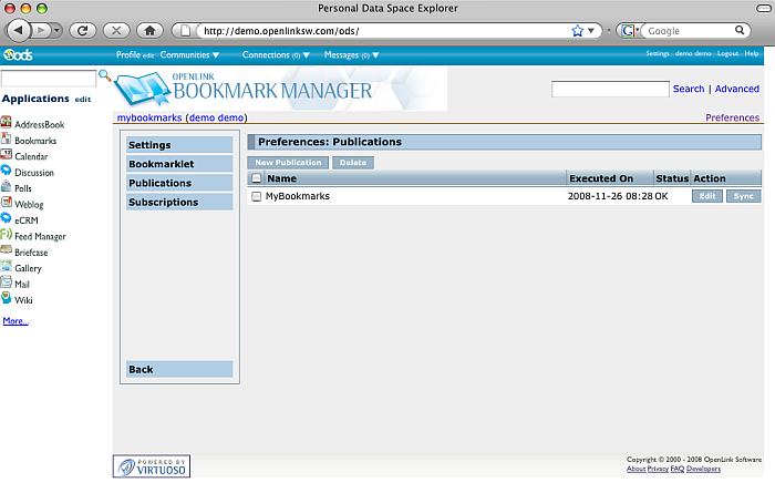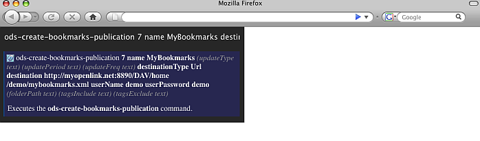 ods-create-bookmarks-publication 7 name MyBookmarks destinationType Url destination http://myopenlink.net:8890/DAV/home/demo/mybookmarks.xml userName demo userPassword demo