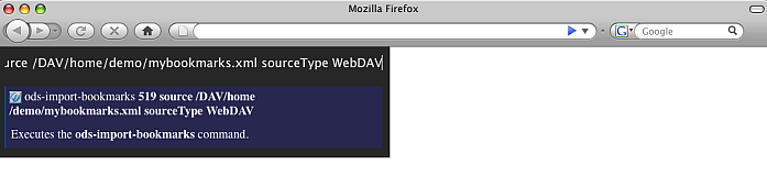 ods-import-bookmarks 519 source /DAV/home/demo/mybookmarks.xml sourceType WebDAV