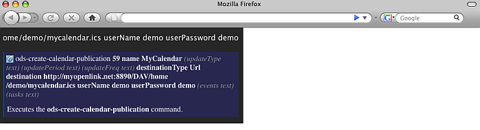 ods-create-calendar-publication 59 name MyCalendar destinationType Url destination http://myopenlink.net:8890/DAV/home/demo/mycalendar.ics userName demo userPassword demo
