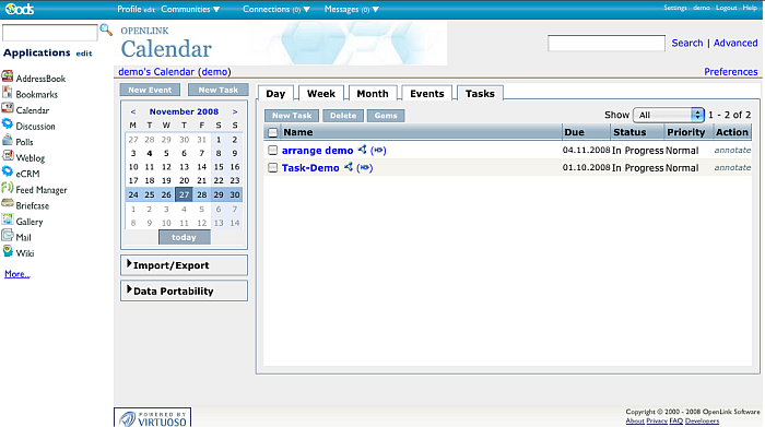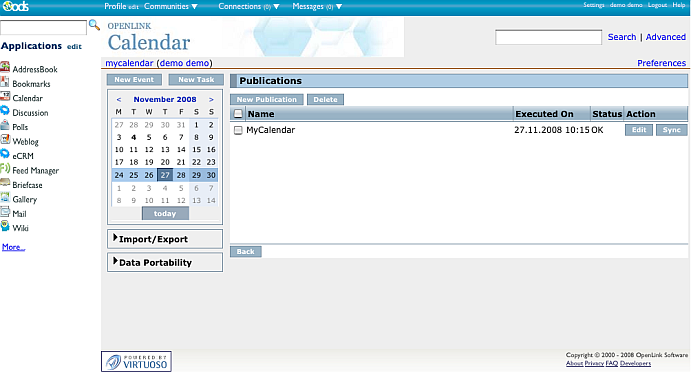 In order to be executed correctly the steps below, there should be ODS Calendar instance for user demo at the Demo server and there should be ODS Calendar instance for user demo at the MyOpenlink server. If not existing, it is enough after log in to go to Calendar from the left ODS Vertical Main Navigation. This will cause automatically to be created ODS Calendar instance.