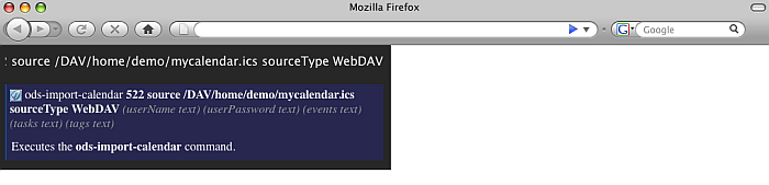 ods-import-calendar 522 source /DAV/home/demo/mycalendar.ics sourceType WebDAV