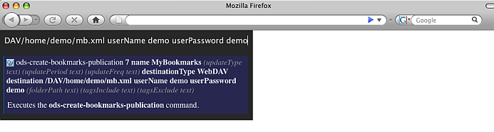 ods-create-bookmarks-publication 7 name MyBookmarks destinationType WebDAV destination /DAV/home/demo/mb.xml userName demo userPassword demo