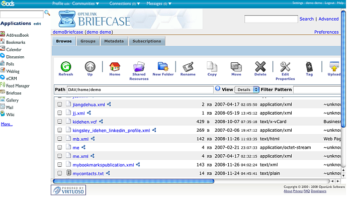 - As result in the list will be shown the mb.xml file which contains user demo's Bookmarks from its Demo server Bookmark instance.