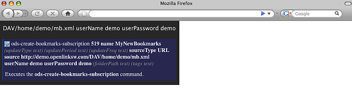 ods-import-bookmarks 519 source /DAV/home/demo/mb.xml sourceType WebDAV or execute: ods-create-bookmarks-subscription 519 name MyNewBookmarks sourceType URL source http://myopenlink.net:8890/DAV/home/demo/mb.xml userName demo userPassword demo