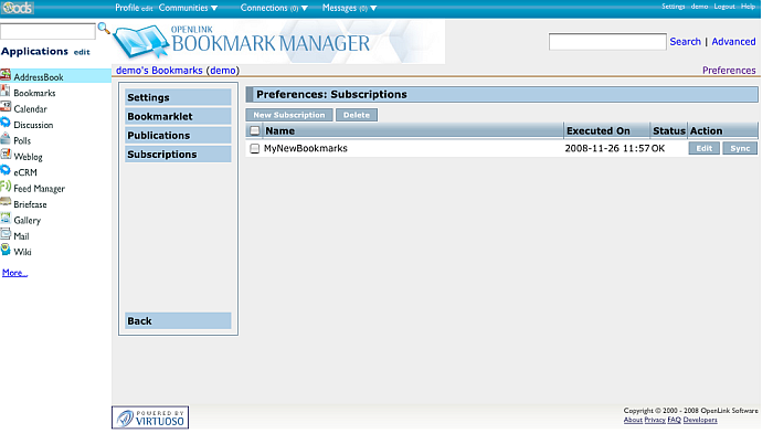 - Now let's perform synchronization of this subscription in the Bookmarks instance for user demo at the MyOpenlink server.